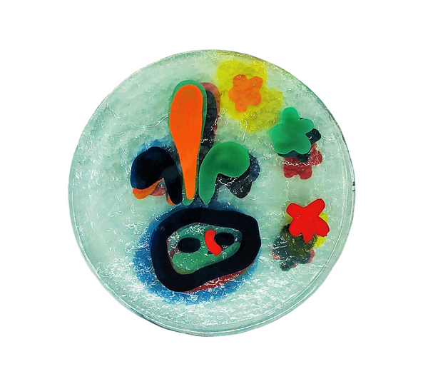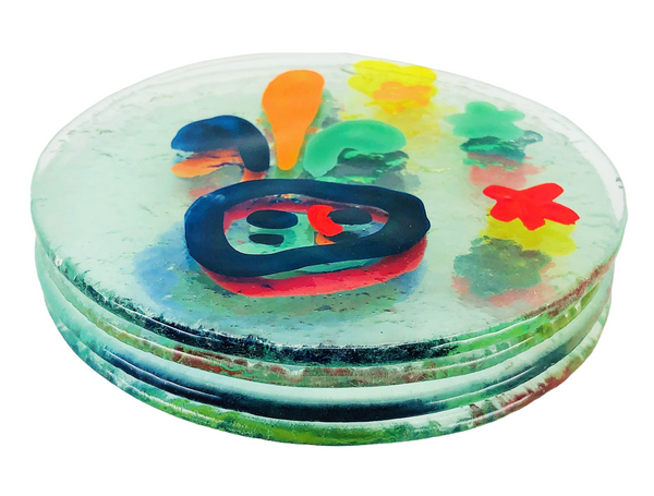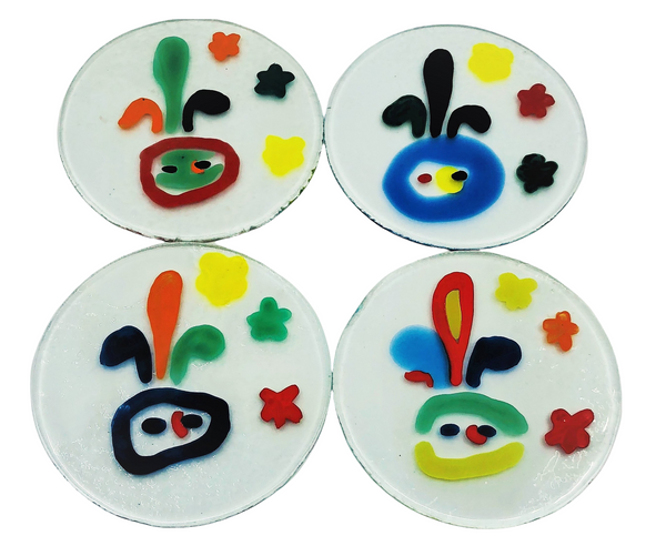 Description: Amazing set of 4 textured glass Hand painted coasters. These are a hard bunch to give up as the design seems to be Basquiat inspired or of that era. Coffee Table Decor, these are art standing alone.