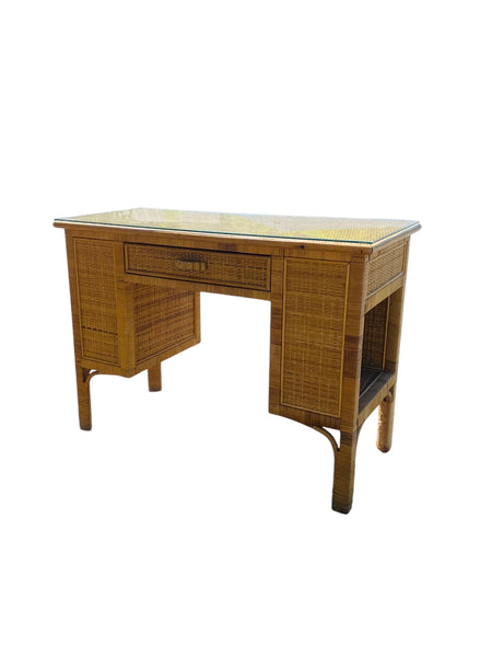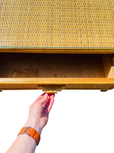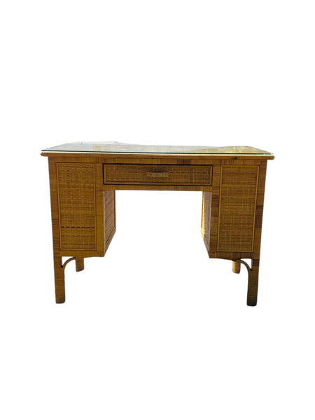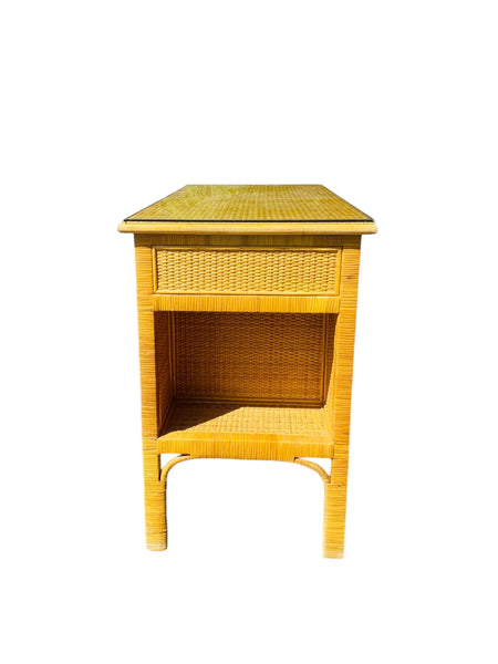 Gorgeous coastal rattan wrapped writers desk. One(1) middle drawer with two(2) storage nooks on either side and glass top. In absolute pristine condition.